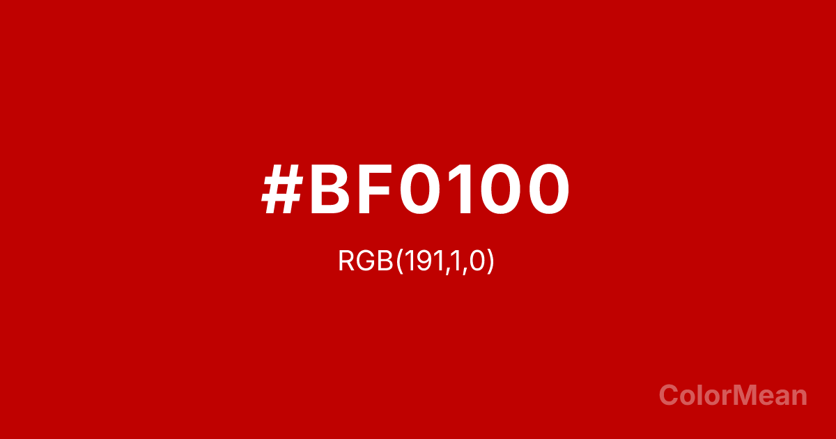 #BF0100 RGB value is (191, 1, 0). The hex color red value is 191, green is 1, and blue is 0. Its HSL format shows a hue of 0°, saturation of 100 percent, and lightness of 37 percent. The CMYK process values are 0 percent, 99 percent, 100 percent, 25 percent.