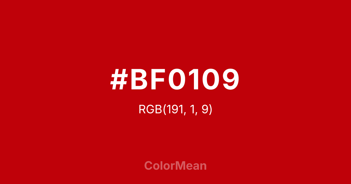 #BF0109 RGB value is (191, 1, 9). The hex color red value is 191, green is 1, and blue is 9. Its HSL format shows a hue of 357°, saturation of 99 percent, and lightness of 38 percent. The CMYK process values are 0 percent, 99 percent, 95 percent, 25 percent.