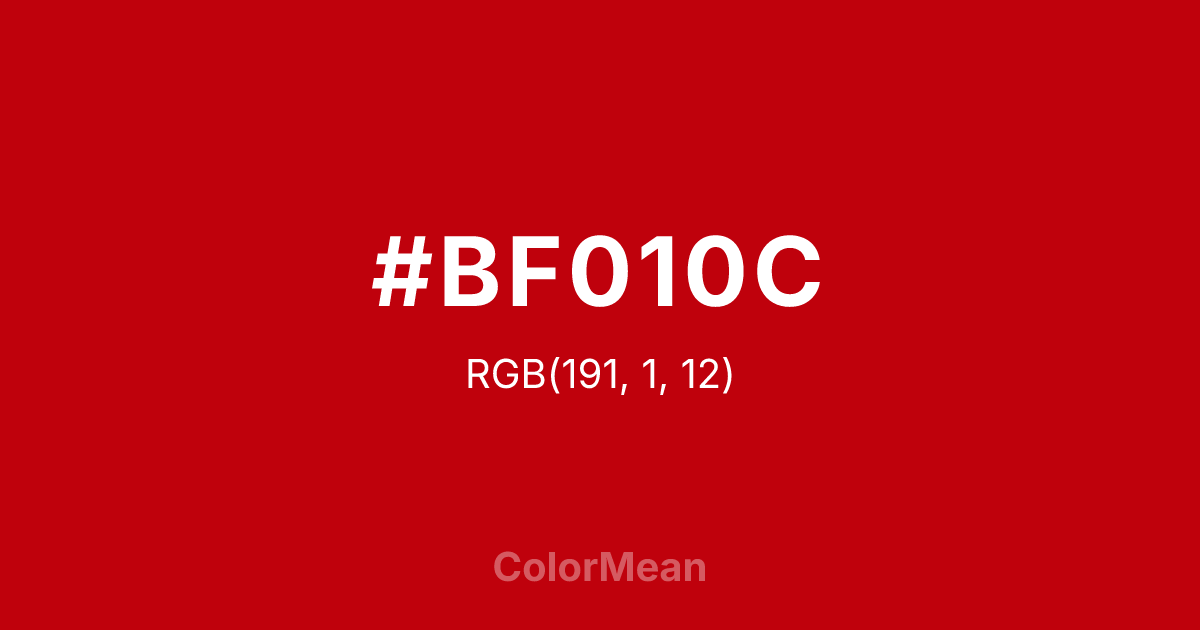 #BF010C RGB value is (191, 1, 12). The hex color red value is 191, green is 1, and blue is 12. Its HSL format shows a hue of 357°, saturation of 99 percent, and lightness of 38 percent. The CMYK process values are 0 percent, 99 percent, 94 percent, 25 percent.