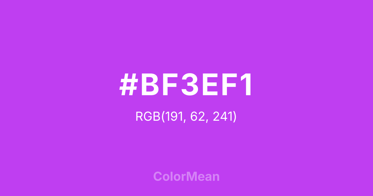 #BF3EF1 RGB value is (191, 62, 241). The hex color red value is 191, green is 62, and blue is 241. Its HSL format shows a hue of 283°, saturation of 86 percent, and lightness of 59 percent. The CMYK process values are 21 percent, 74 percent, 0 percent, 5 percent.