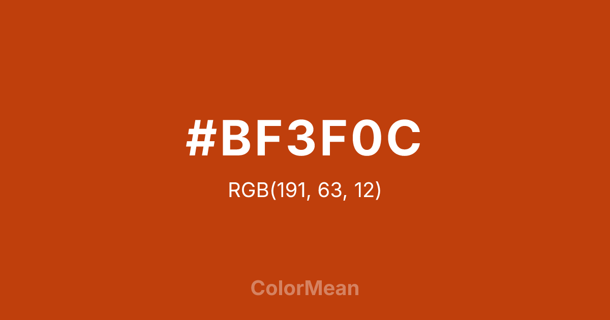 #BF3F0C RGB value is (191, 63, 12). The hex color red value is 191, green is 63, and blue is 12. Its HSL format shows a hue of 17°, saturation of 88 percent, and lightness of 40 percent. The CMYK process values are 0 percent, 67 percent, 94 percent, 25 percent.