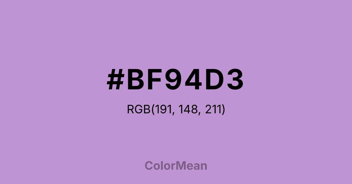#BF94D3 RGB value is (191, 148, 211). The hex color red value is 191, green is 148, and blue is 211. Its HSL format shows a hue of 281°, saturation of 42 percent, and lightness of 70 percent. The CMYK process values are 9 percent, 30 percent, 0 percent, 17 percent.
