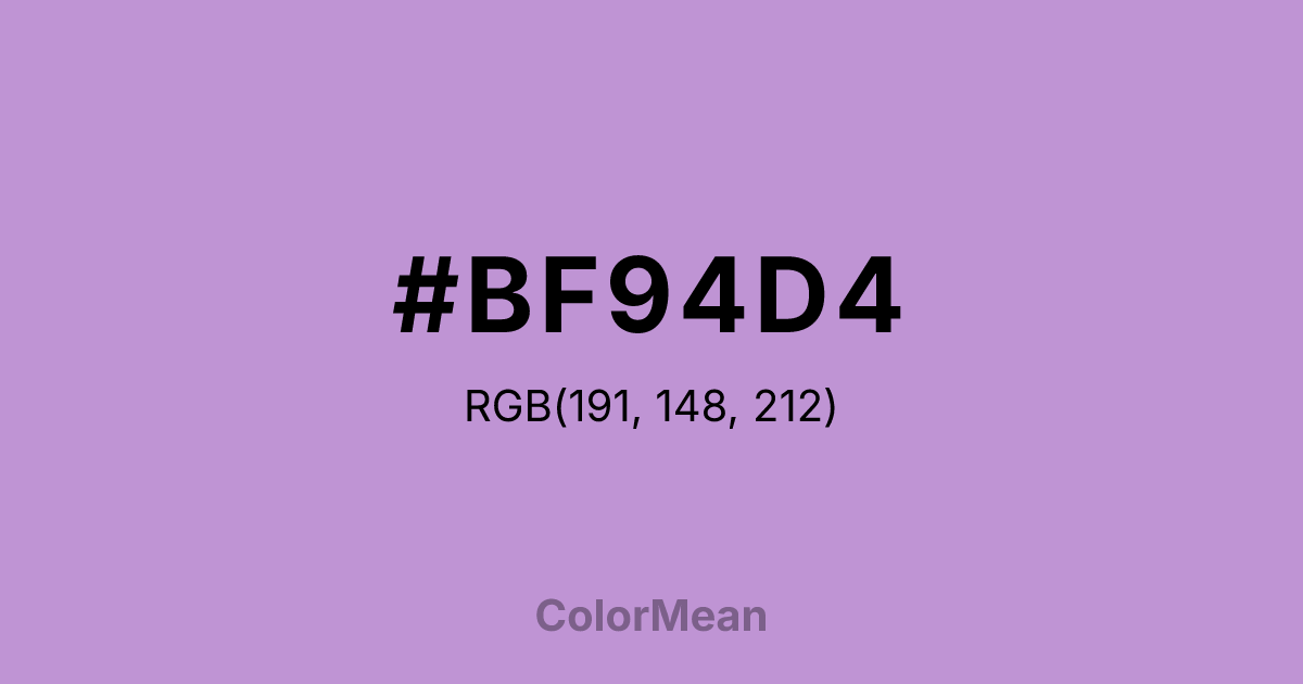 #BF94D4 RGB value is (191, 148, 212). The hex color red value is 191, green is 148, and blue is 212. Its HSL format shows a hue of 280°, saturation of 43 percent, and lightness of 71 percent. The CMYK process values are 10 percent, 30 percent, 0 percent, 17 percent.