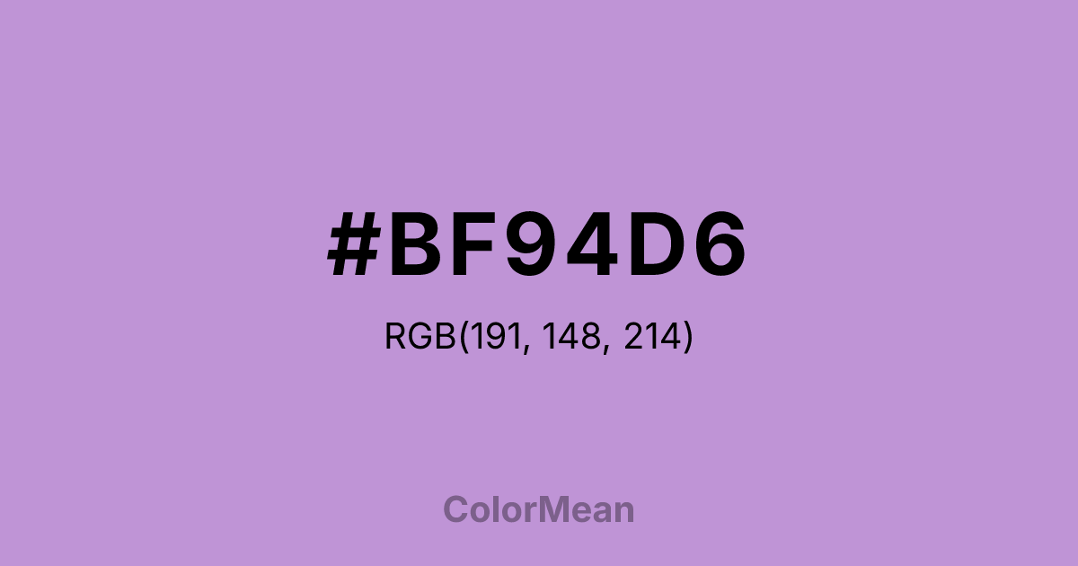 #BF94D6 RGB value is (191, 148, 214). The hex color red value is 191, green is 148, and blue is 214. Its HSL format shows a hue of 279°, saturation of 45 percent, and lightness of 71 percent. The CMYK process values are 11 percent, 31 percent, 0 percent, 16 percent.