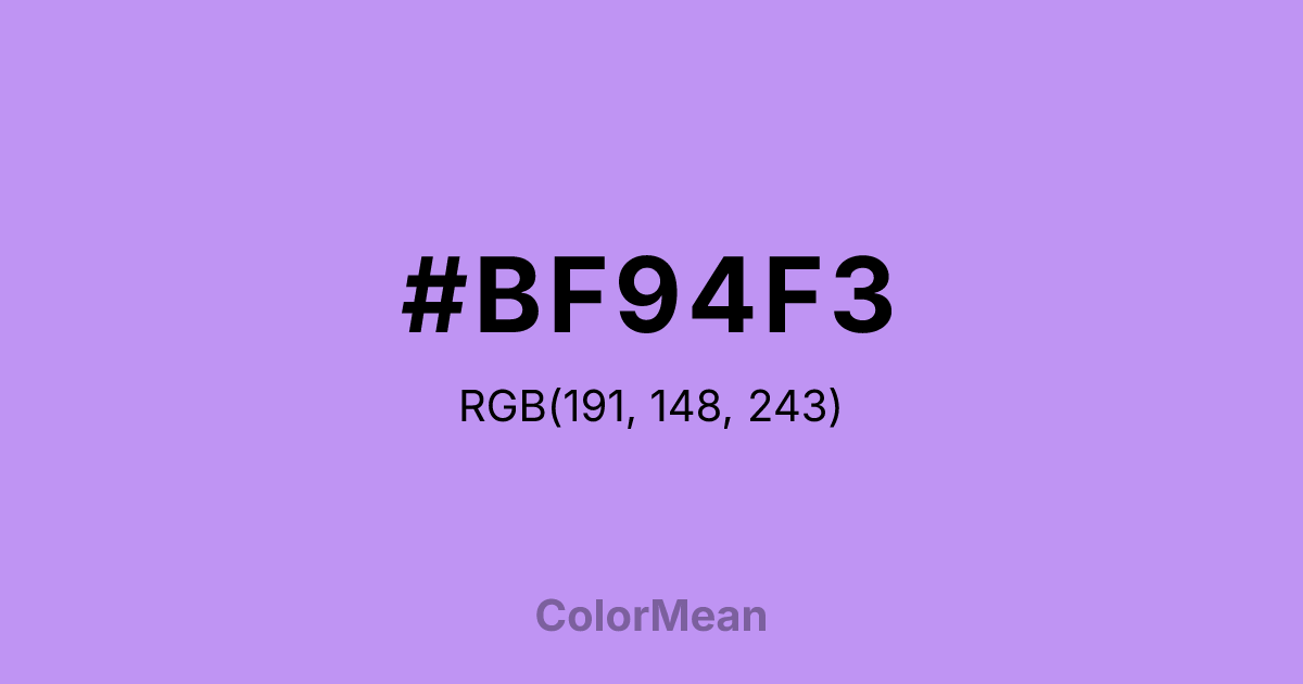 #BF94F3 RGB value is (191, 148, 243). The hex color red value is 191, green is 148, and blue is 243. Its HSL format shows a hue of 267°, saturation of 80 percent, and lightness of 77 percent. The CMYK process values are 21 percent, 39 percent, 0 percent, 5 percent.