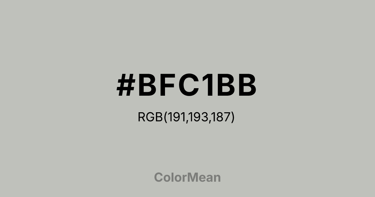 #BFC1BB RGB value is (191, 193, 187). The hex color red value is 191, green is 193, and blue is 187. Its HSL format shows a hue of 80°, saturation of 5 percent, and lightness of 75 percent. The CMYK process values are 1 percent, 0 percent, 3 percent, 24 percent.