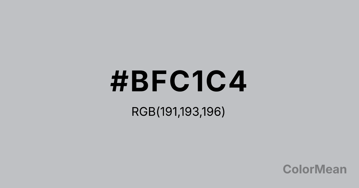 #BFC1C4 RGB value is (191, 193, 196). The hex color red value is 191, green is 193, and blue is 196. Its HSL format shows a hue of 216°, saturation of 4 percent, and lightness of 76 percent. The CMYK process values are 3 percent, 2 percent, 0 percent, 23 percent.