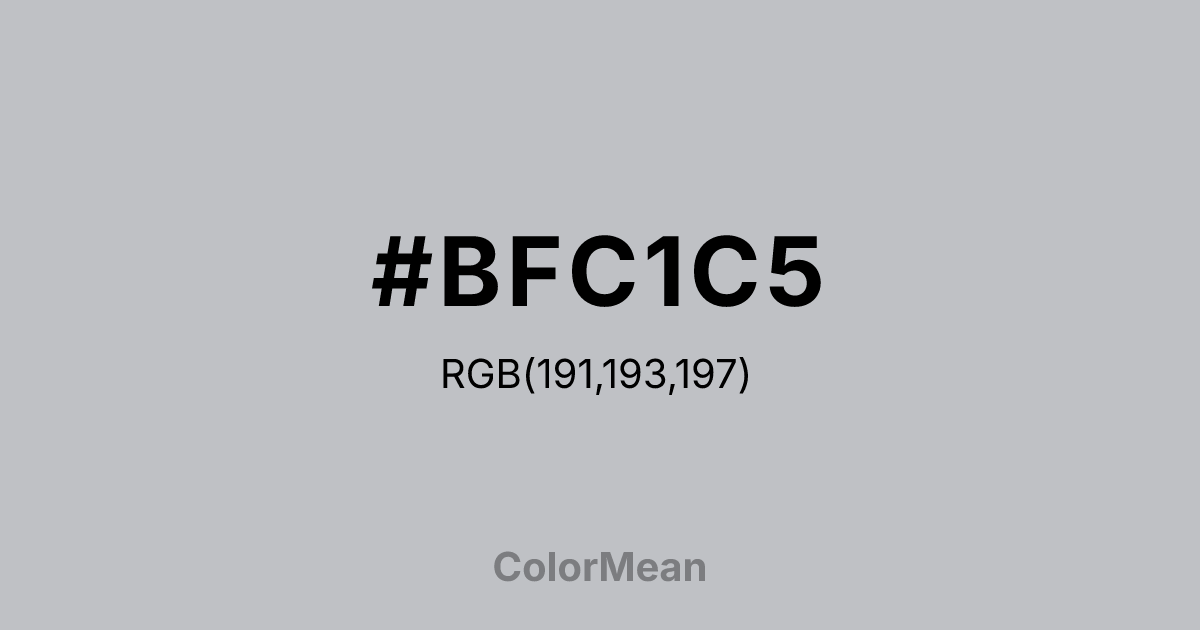 #BFC1C5 RGB value is (191, 193, 197). The hex color red value is 191, green is 193, and blue is 197. Its HSL format shows a hue of 220°, saturation of 5 percent, and lightness of 76 percent. The CMYK process values are 3 percent, 2 percent, 0 percent, 23 percent.