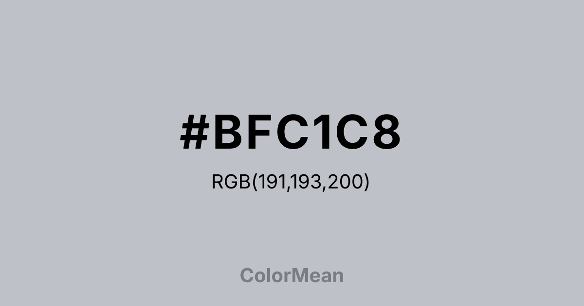#BFC1C8 RGB value is (191, 193, 200). The hex color red value is 191, green is 193, and blue is 200. Its HSL format shows a hue of 227°, saturation of 8 percent, and lightness of 77 percent. The CMYK process values are 4 percent, 4 percent, 0 percent, 22 percent.