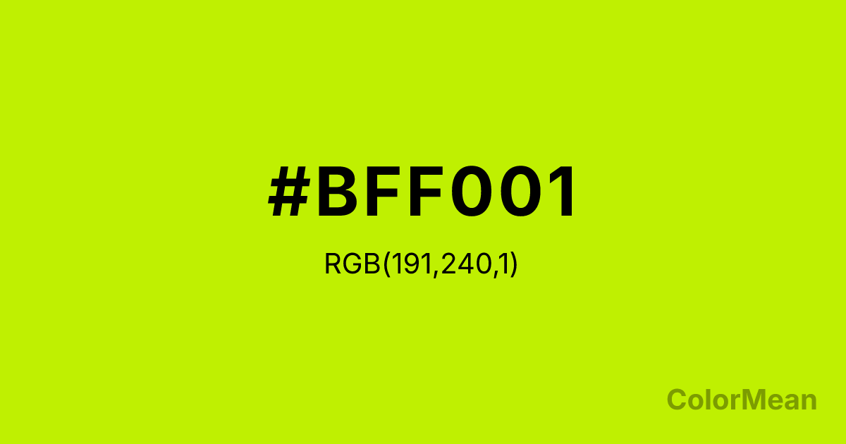 #BFF001 RGB value is (191, 240, 1). The hex color red value is 191, green is 240, and blue is 1. Its HSL format shows a hue of 72°, saturation of 99 percent, and lightness of 47 percent. The CMYK process values are 20 percent, 0 percent, 100 percent, 6 percent.