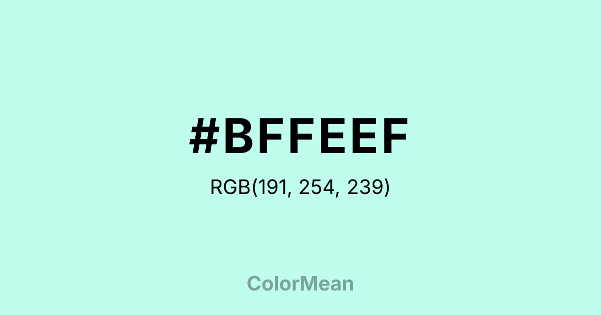 #BFFEEF RGB value is (191, 254, 239). The hex color red value is 191, green is 254, and blue is 239. Its HSL format shows a hue of 166°, saturation of 97 percent, and lightness of 87 percent. The CMYK process values are 25 percent, 0 percent, 6 percent, 0 percent.