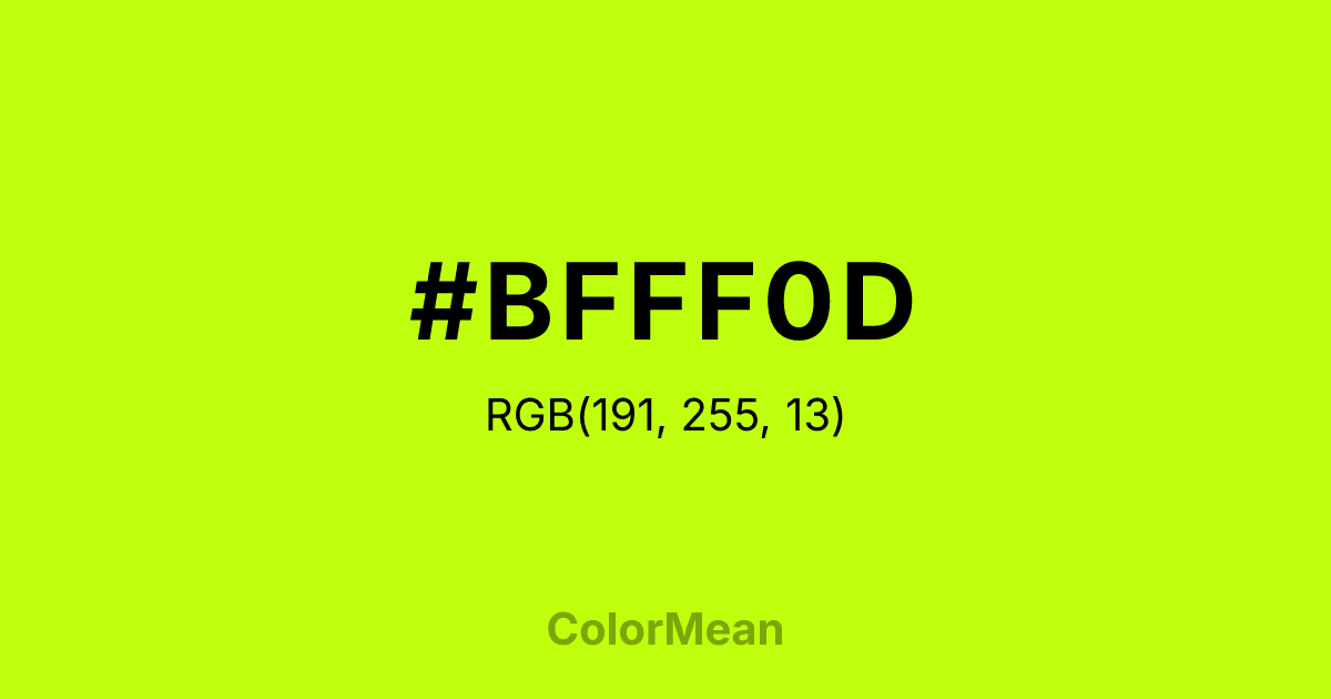 #BFFF0D RGB value is (191, 255, 13). The hex color red value is 191, green is 255, and blue is 13. Its HSL format shows a hue of 76°, saturation of 100 percent, and lightness of 53 percent. The CMYK process values are 25 percent, 0 percent, 95 percent, 0 percent.