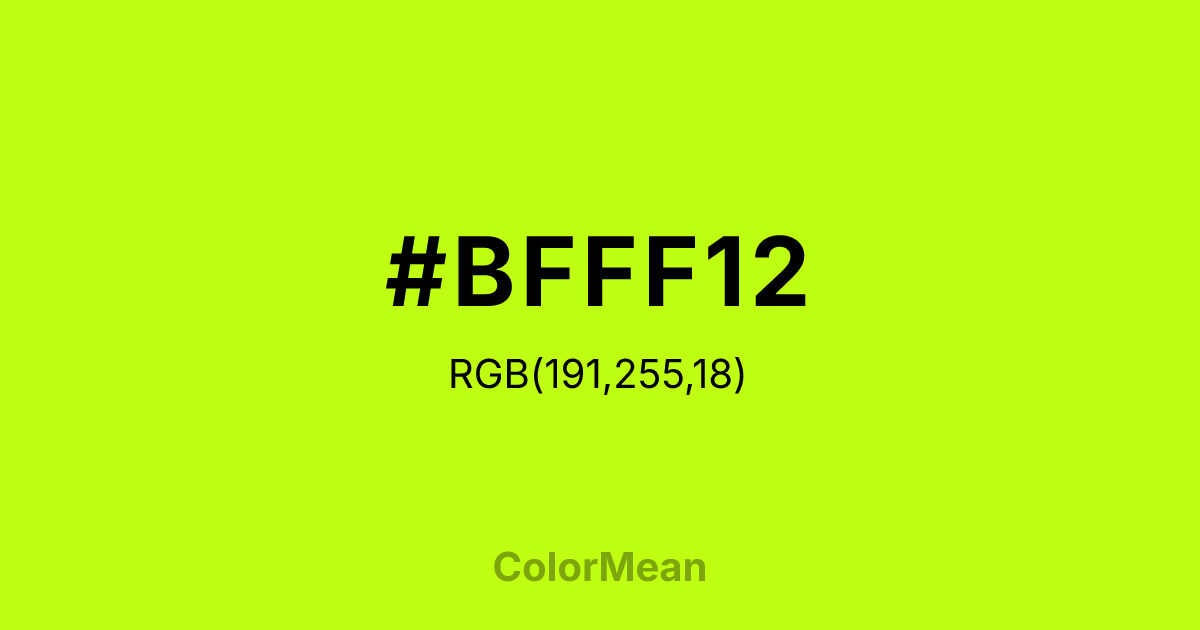#BFFF12 RGB value is (191, 255, 18). The hex color red value is 191, green is 255, and blue is 18. Its HSL format shows a hue of 76°, saturation of 100 percent, and lightness of 54 percent. The CMYK process values are 25 percent, 0 percent, 93 percent, 0 percent.