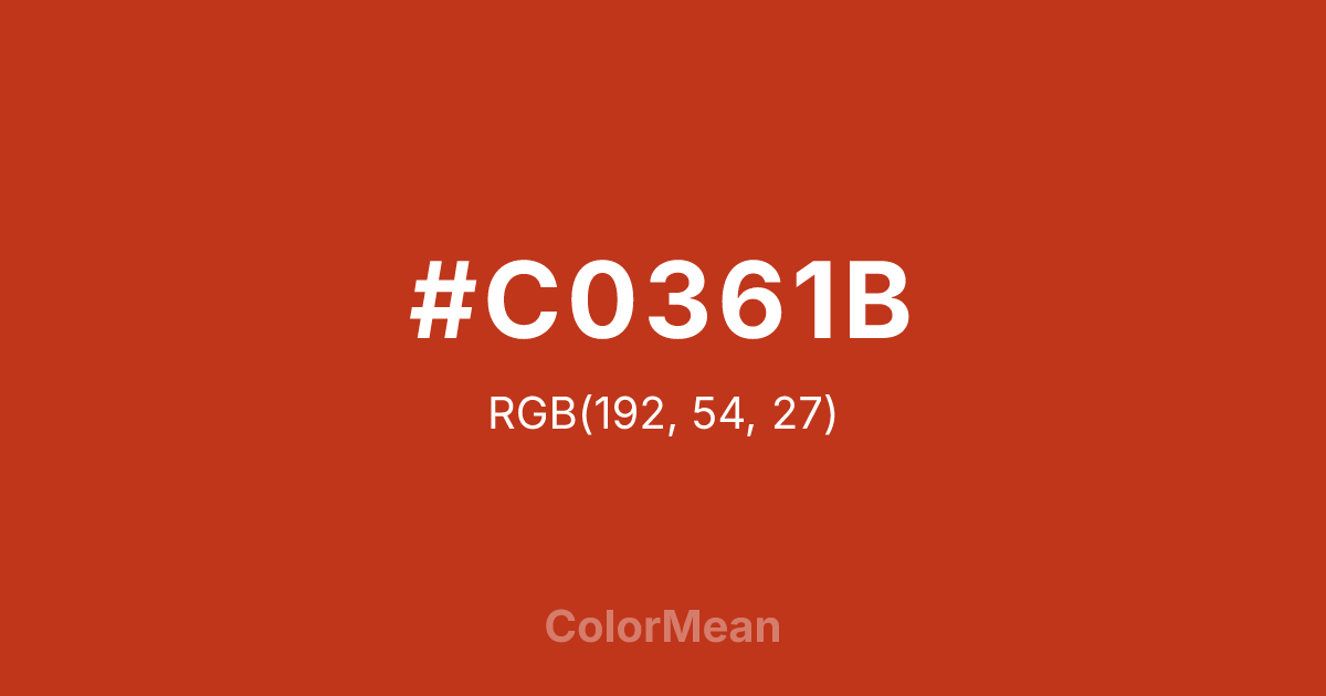 #C0361B RGB value is (192, 54, 27). The hex color red value is 192, green is 54, and blue is 27. Its HSL format shows a hue of 10°, saturation of 75 percent, and lightness of 43 percent. The CMYK process values are 0 percent, 72 percent, 86 percent, 25 percent.