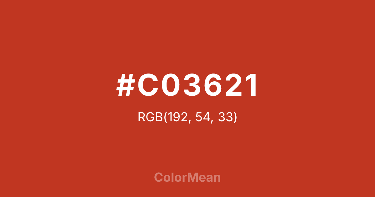 #C03621 RGB value is (192, 54, 33). The hex color red value is 192, green is 54, and blue is 33. Its HSL format shows a hue of 8°, saturation of 71 percent, and lightness of 44 percent. The CMYK process values are 0 percent, 72 percent, 83 percent, 25 percent.
