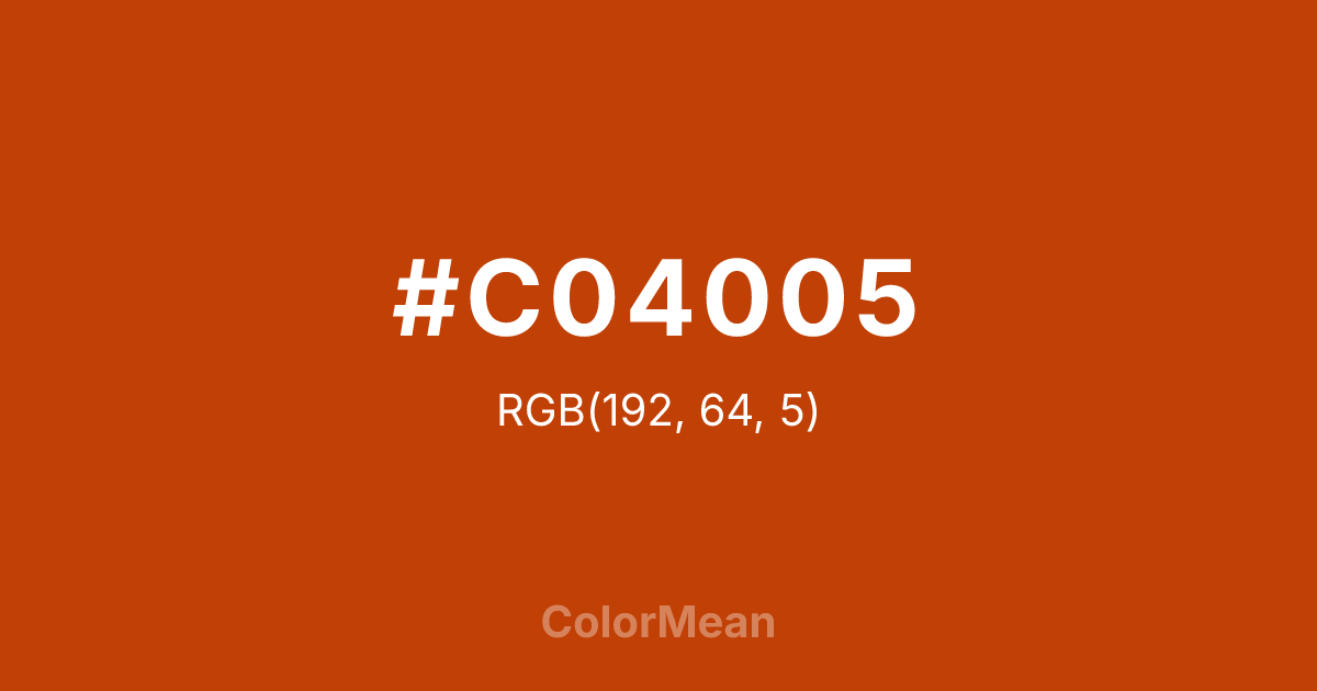 #C04005 RGB value is (192, 64, 5). The hex color red value is 192, green is 64, and blue is 5. Its HSL format shows a hue of 19°, saturation of 95 percent, and lightness of 39 percent. The CMYK process values are 0 percent, 67 percent, 97 percent, 25 percent.