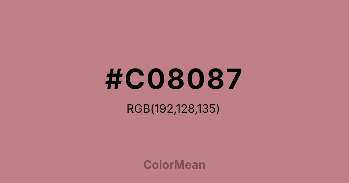 #C08087 RGB value is (192, 128, 135). The hex color red value is 192, green is 128, and blue is 135. Its HSL format shows a hue of 353°, saturation of 34 percent, and lightness of 63 percent. The CMYK process values are 0 percent, 33 percent, 30 percent, 25 percent.