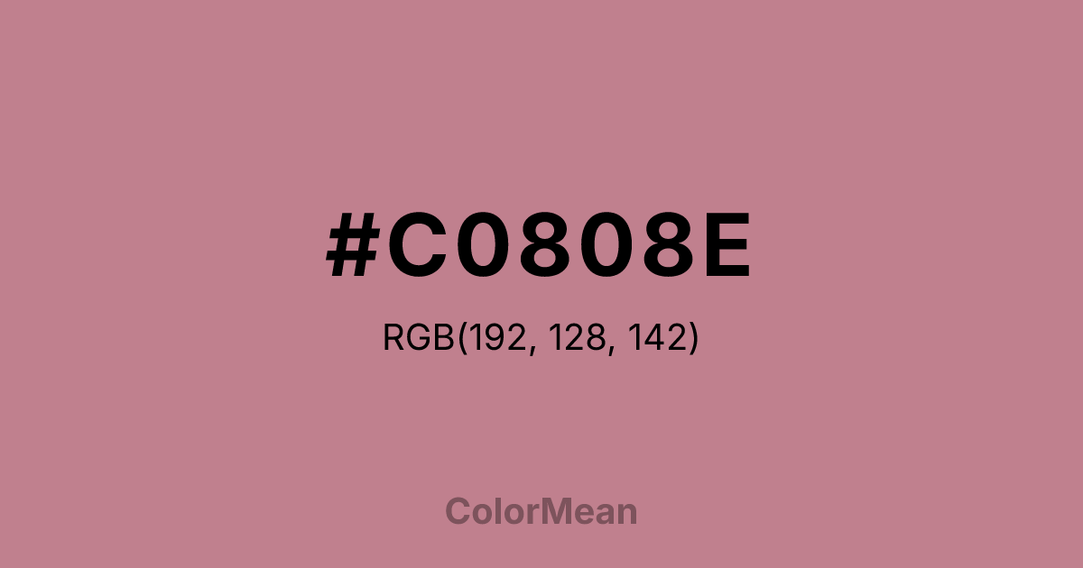 #C0808E RGB value is (192, 128, 142). The hex color red value is 192, green is 128, and blue is 142. Its HSL format shows a hue of 347°, saturation of 34 percent, and lightness of 63 percent. The CMYK process values are 0 percent, 33 percent, 26 percent, 25 percent.