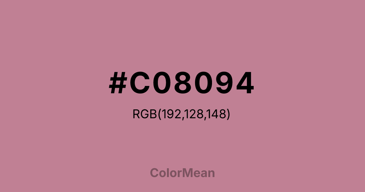 #C08094 RGB value is (192, 128, 148). The hex color red value is 192, green is 128, and blue is 148. Its HSL format shows a hue of 341°, saturation of 34 percent, and lightness of 63 percent. The CMYK process values are 0 percent, 33 percent, 23 percent, 25 percent.