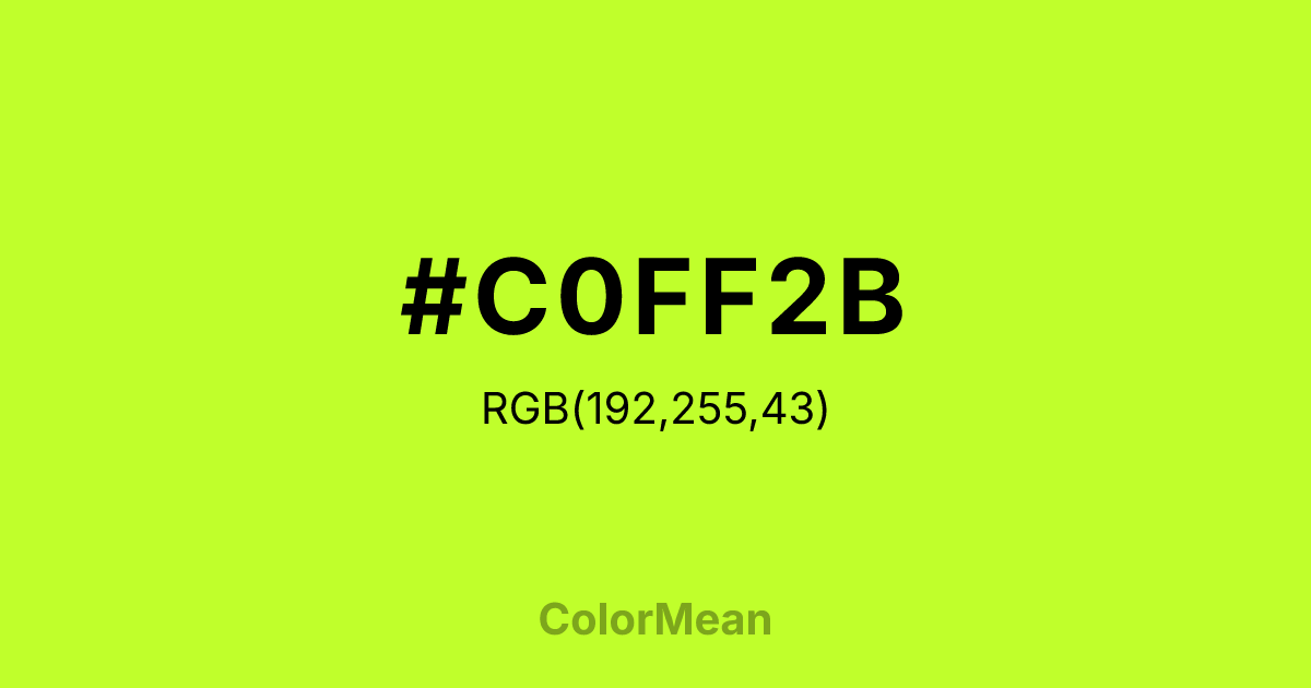 #C0FF2B RGB value is (192, 255, 43). The hex color red value is 192, green is 255, and blue is 43. Its HSL format shows a hue of 78°, saturation of 100 percent, and lightness of 58 percent. The CMYK process values are 25 percent, 0 percent, 83 percent, 0 percent.