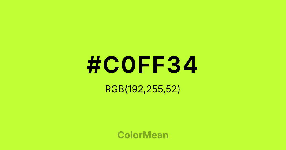 #C0FF34 RGB value is (192, 255, 52). The hex color red value is 192, green is 255, and blue is 52. Its HSL format shows a hue of 79°, saturation of 100 percent, and lightness of 60 percent. The CMYK process values are 25 percent, 0 percent, 80 percent, 0 percent.