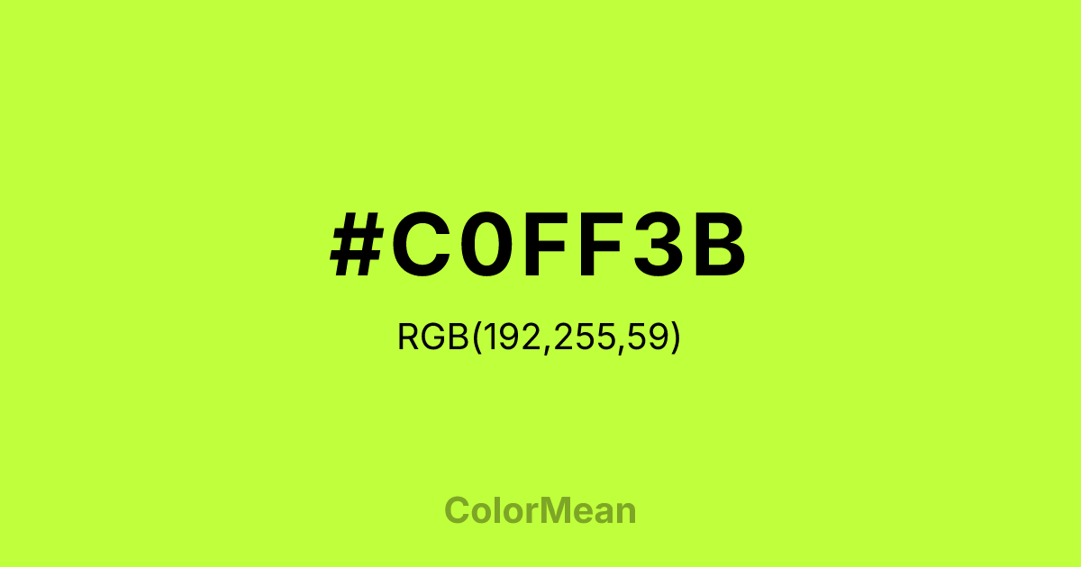 #C0FF3B RGB value is (192, 255, 59). The hex color red value is 192, green is 255, and blue is 59. Its HSL format shows a hue of 79°, saturation of 100 percent, and lightness of 62 percent. The CMYK process values are 25 percent, 0 percent, 77 percent, 0 percent.