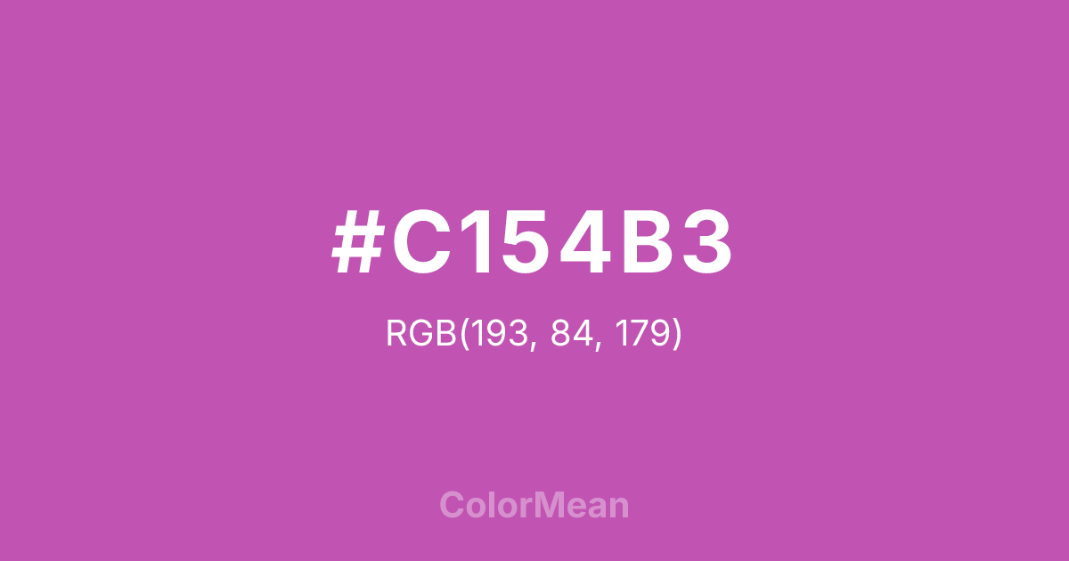 #C154B3 RGB value is (193, 84, 179). The hex color red value is 193, green is 84, and blue is 179. Its HSL format shows a hue of 308°, saturation of 47 percent, and lightness of 54 percent. The CMYK process values are 0 percent, 56 percent, 7 percent, 24 percent.