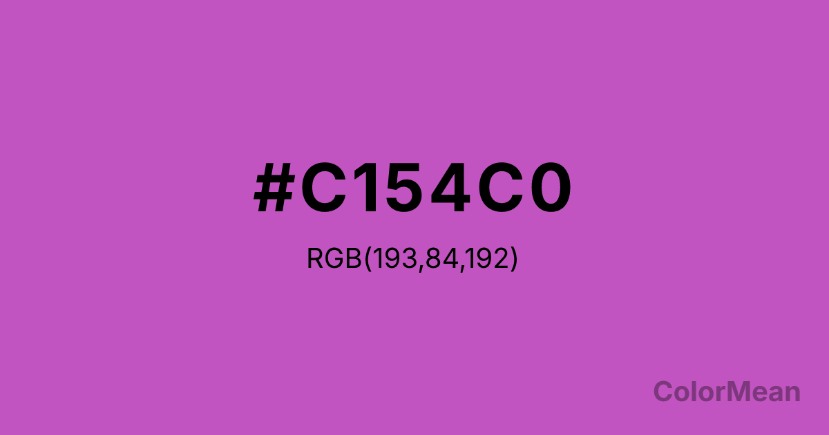 #C154C0 RGB value is (193, 84, 192). The hex color red value is 193, green is 84, and blue is 192. Its HSL format shows a hue of 301°, saturation of 47 percent, and lightness of 54 percent. The CMYK process values are 0 percent, 56 percent, 1 percent, 24 percent.