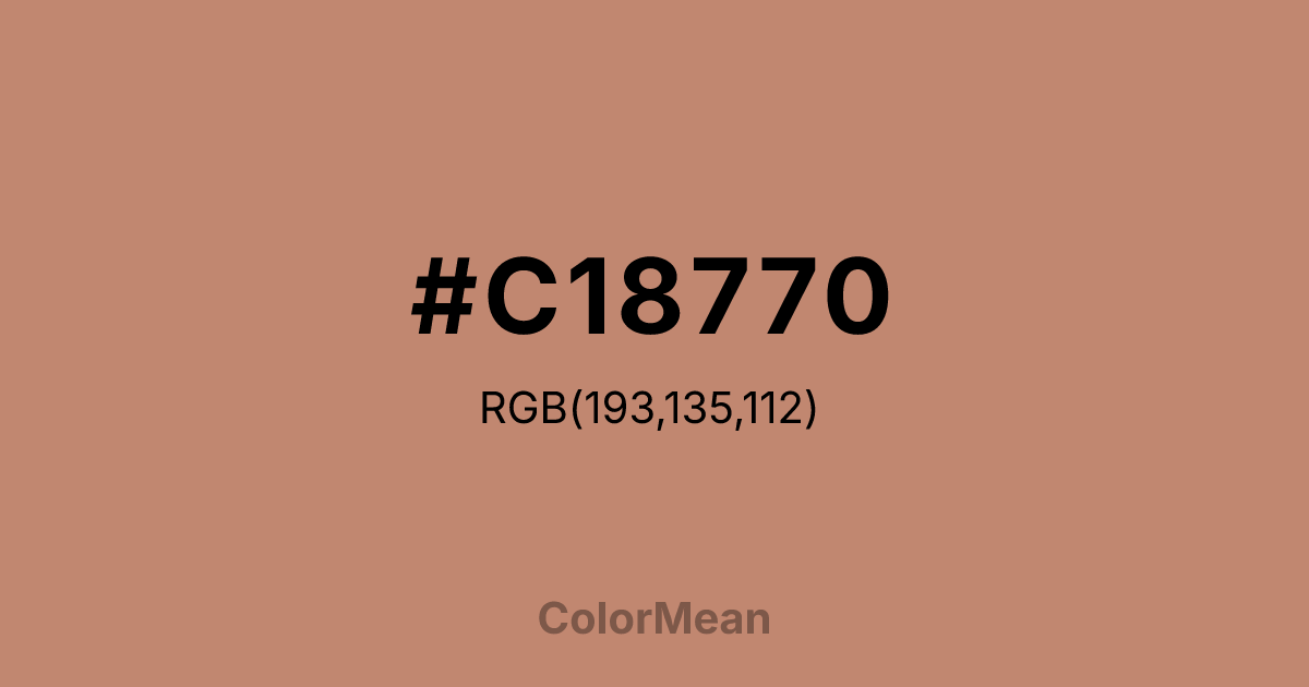 #C18770 RGB value is (193, 135, 112). The hex color red value is 193, green is 135, and blue is 112. Its HSL format shows a hue of 17°, saturation of 40 percent, and lightness of 60 percent. The CMYK process values are 0 percent, 30 percent, 42 percent, 24 percent.