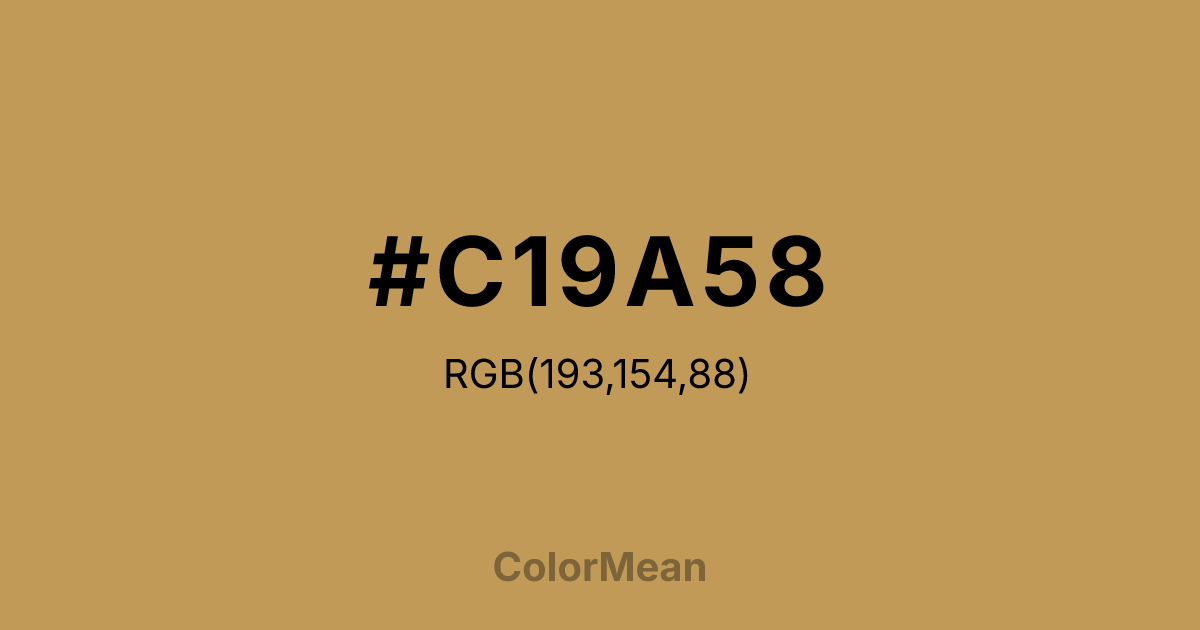 #C19A58 RGB value is (193, 154, 88). The hex color red value is 193, green is 154, and blue is 88. Its HSL format shows a hue of 38°, saturation of 46 percent, and lightness of 55 percent. The CMYK process values are 0 percent, 20 percent, 54 percent, 24 percent.