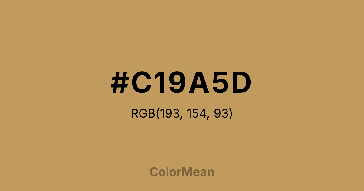 #C19A5D RGB value is (193, 154, 93). The hex color red value is 193, green is 154, and blue is 93. Its HSL format shows a hue of 37°, saturation of 45 percent, and lightness of 56 percent. The CMYK process values are 0 percent, 20 percent, 52 percent, 24 percent.