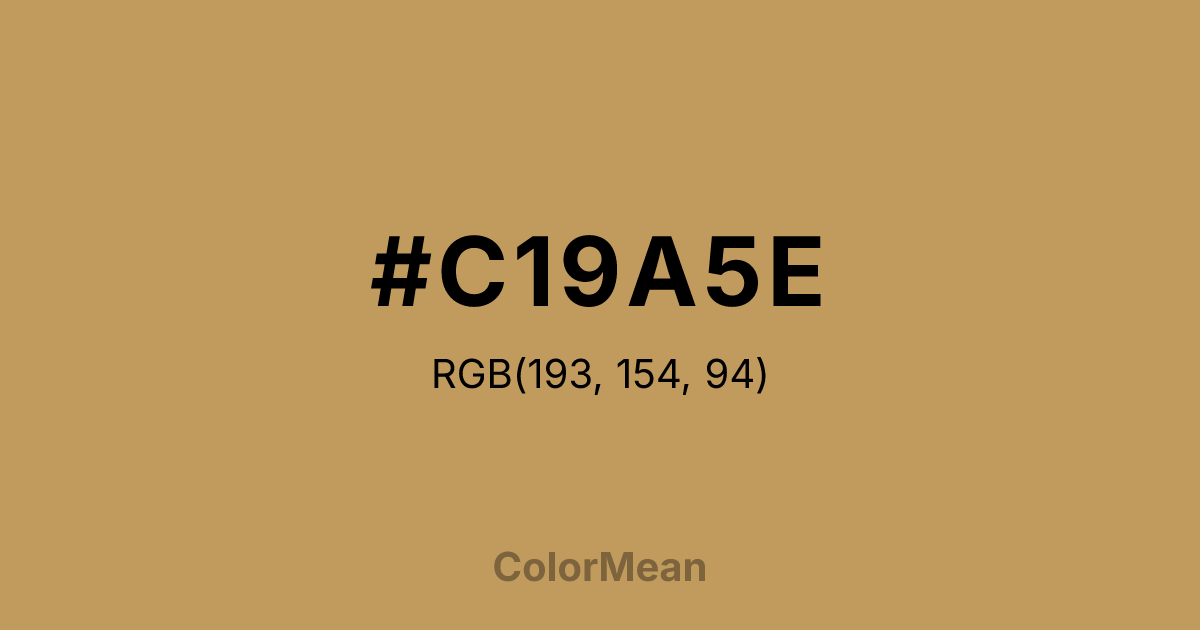 #C19A5E RGB value is (193, 154, 94). The hex color red value is 193, green is 154, and blue is 94. Its HSL format shows a hue of 36°, saturation of 44 percent, and lightness of 56 percent. The CMYK process values are 0 percent, 20 percent, 51 percent, 24 percent.