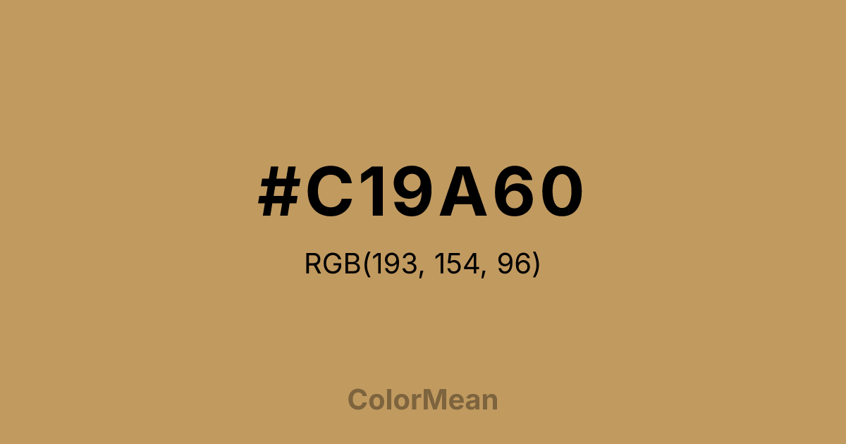 #C19A60 RGB value is (193, 154, 96). The hex color red value is 193, green is 154, and blue is 96. Its HSL format shows a hue of 36°, saturation of 44 percent, and lightness of 57 percent. The CMYK process values are 0 percent, 20 percent, 50 percent, 24 percent.