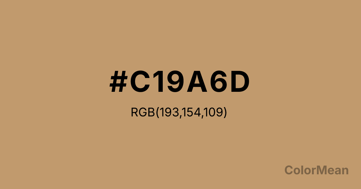 #C19A6D RGB value is (193, 154, 109). The hex color red value is 193, green is 154, and blue is 109. Its HSL format shows a hue of 32°, saturation of 40 percent, and lightness of 59 percent. The CMYK process values are 0 percent, 20 percent, 44 percent, 24 percent.