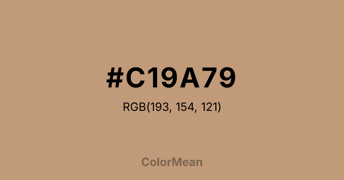 #C19A79 RGB value is (193, 154, 121). The hex color red value is 193, green is 154, and blue is 121. Its HSL format shows a hue of 27°, saturation of 37 percent, and lightness of 62 percent. The CMYK process values are 0 percent, 20 percent, 37 percent, 24 percent.