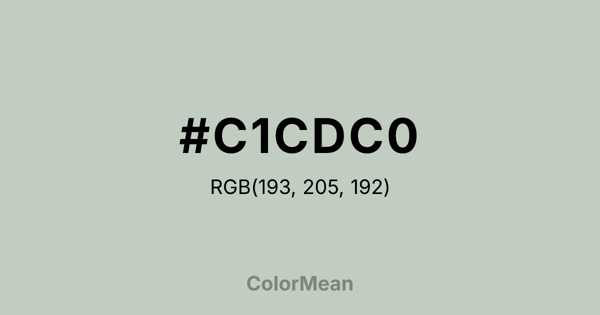 #C1CDC0 RGB value is (193, 205, 192). The hex color red value is 193, green is 205, and blue is 192. Its HSL format shows a hue of 115°, saturation of 12 percent, and lightness of 78 percent. The CMYK process values are 6 percent, 0 percent, 6 percent, 20 percent.