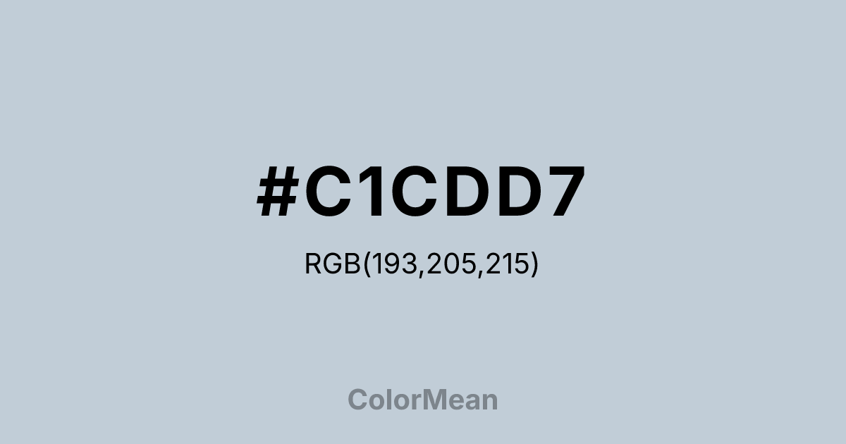 #C1CDD7 RGB value is (193, 205, 215). The hex color red value is 193, green is 205, and blue is 215. Its HSL format shows a hue of 207°, saturation of 22 percent, and lightness of 80 percent. The CMYK process values are 10 percent, 5 percent, 0 percent, 16 percent.