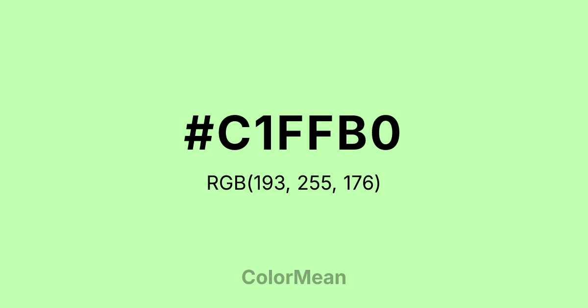#C1FFB0 RGB value is (193, 255, 176). The hex color red value is 193, green is 255, and blue is 176. Its HSL format shows a hue of 107°, saturation of 100 percent, and lightness of 85 percent. The CMYK process values are 24 percent, 0 percent, 31 percent, 0 percent.