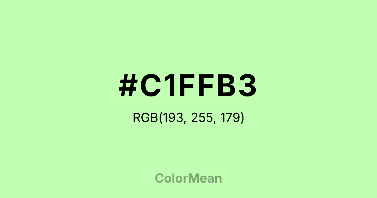 #C1FFB3 RGB value is (193, 255, 179). The hex color red value is 193, green is 255, and blue is 179. Its HSL format shows a hue of 109°, saturation of 100 percent, and lightness of 85 percent. The CMYK process values are 24 percent, 0 percent, 30 percent, 0 percent.