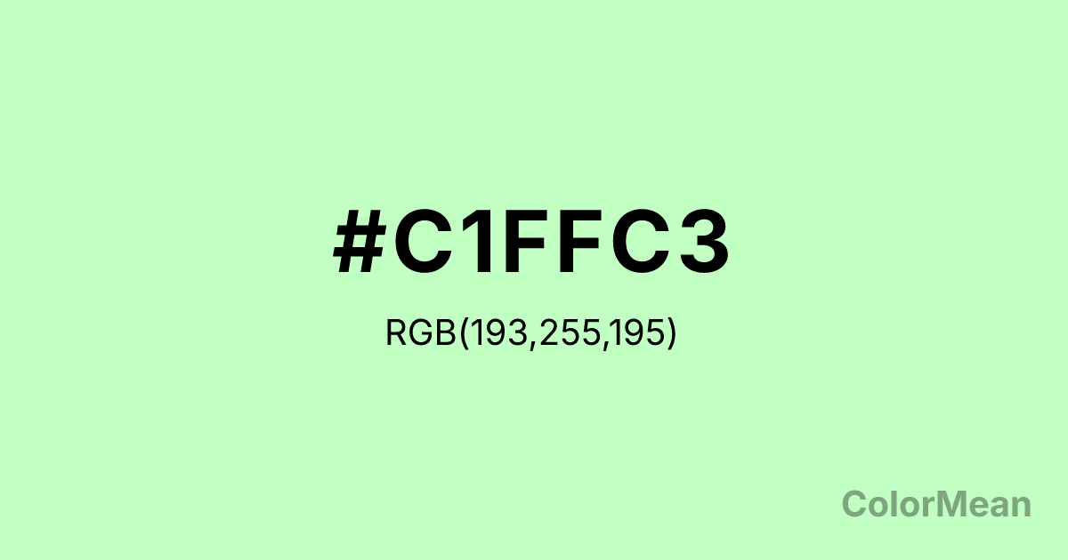 #C1FFC3 RGB value is (193, 255, 195). The hex color red value is 193, green is 255, and blue is 195. Its HSL format shows a hue of 122°, saturation of 100 percent, and lightness of 88 percent. The CMYK process values are 24 percent, 0 percent, 24 percent, 0 percent.