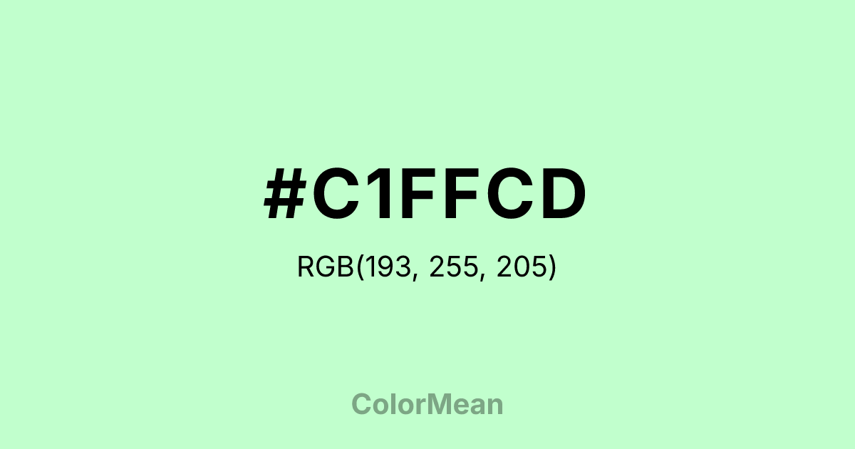 #C1FFCD RGB value is (193, 255, 205). The hex color red value is 193, green is 255, and blue is 205. Its HSL format shows a hue of 132°, saturation of 100 percent, and lightness of 88 percent. The CMYK process values are 24 percent, 0 percent, 20 percent, 0 percent.