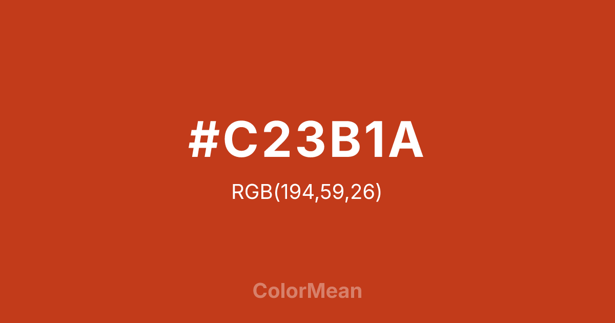 #C23B1A RGB value is (194, 59, 26). The hex color red value is 194, green is 59, and blue is 26. Its HSL format shows a hue of 12°, saturation of 76 percent, and lightness of 43 percent. The CMYK process values are 0 percent, 70 percent, 87 percent, 24 percent.