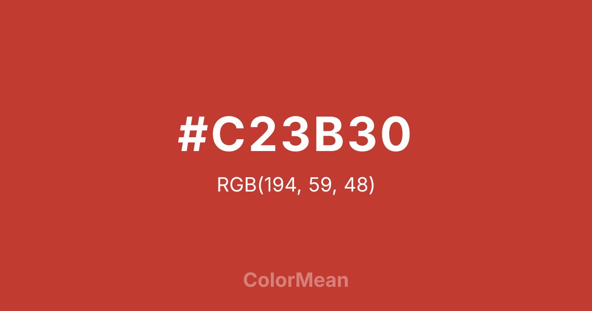 #C23B30 RGB value is (194, 59, 48). The hex color red value is 194, green is 59, and blue is 48. Its HSL format shows a hue of 5°, saturation of 60 percent, and lightness of 47 percent. The CMYK process values are 0 percent, 70 percent, 75 percent, 24 percent.
