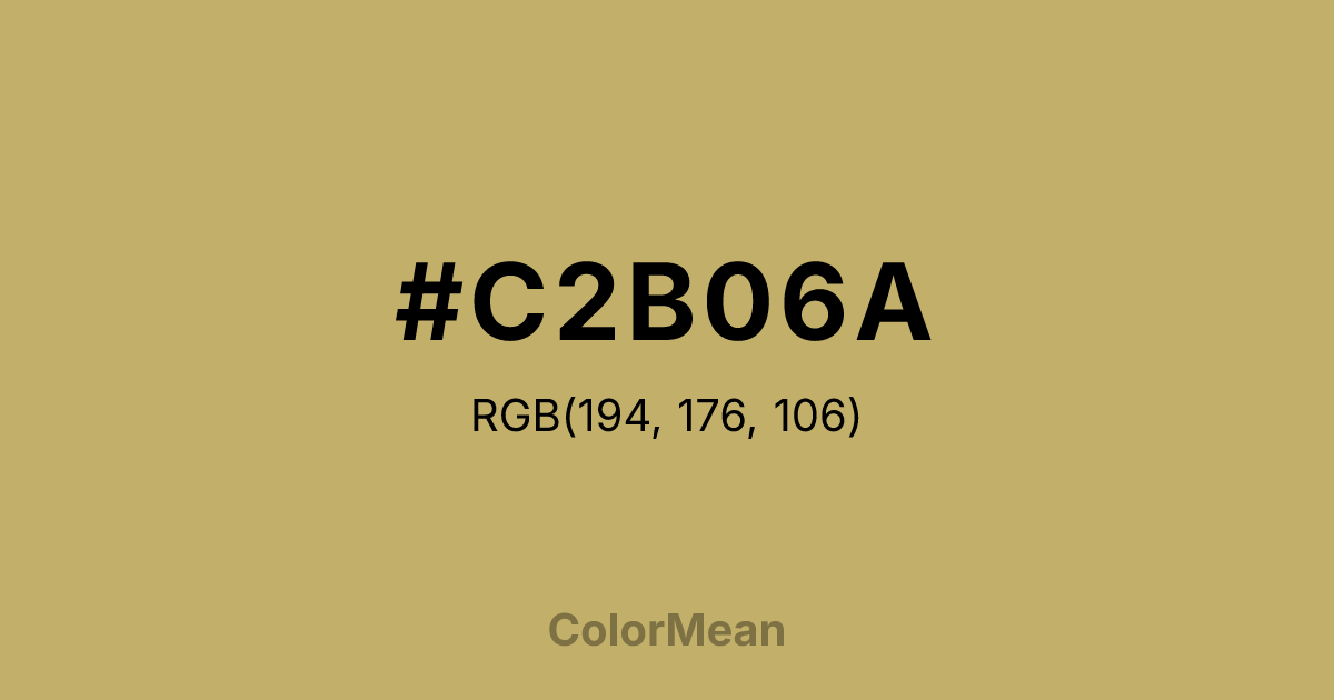 #C2B06A RGB value is (194, 176, 106). The hex color red value is 194, green is 176, and blue is 106. Its HSL format shows a hue of 48°, saturation of 42 percent, and lightness of 59 percent. The CMYK process values are 0 percent, 9 percent, 45 percent, 24 percent.