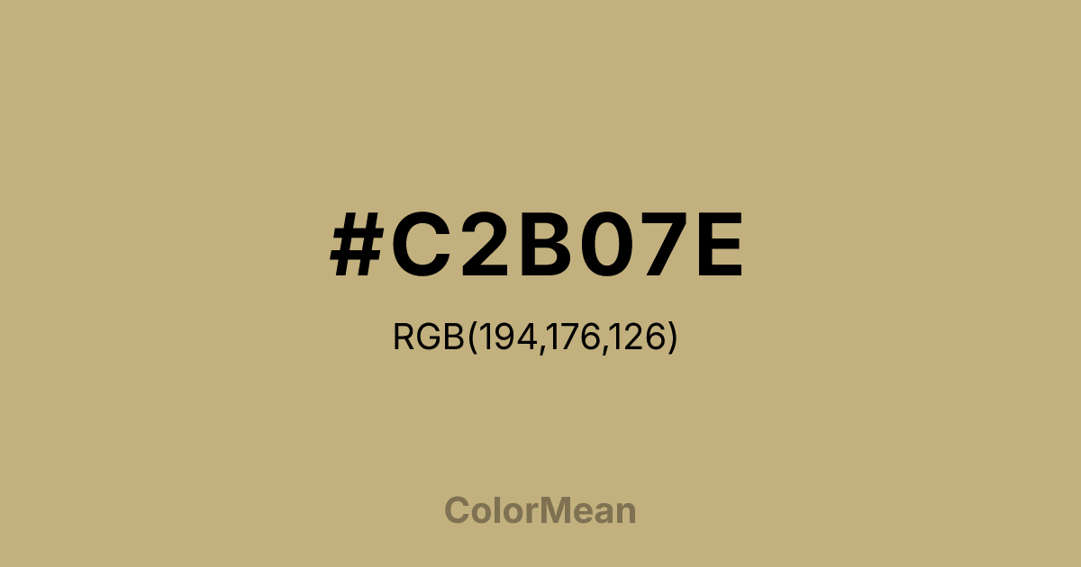 #C2B07E RGB value is (194, 176, 126). The hex color red value is 194, green is 176, and blue is 126. Its HSL format shows a hue of 44°, saturation of 36 percent, and lightness of 63 percent. The CMYK process values are 0 percent, 9 percent, 35 percent, 24 percent.