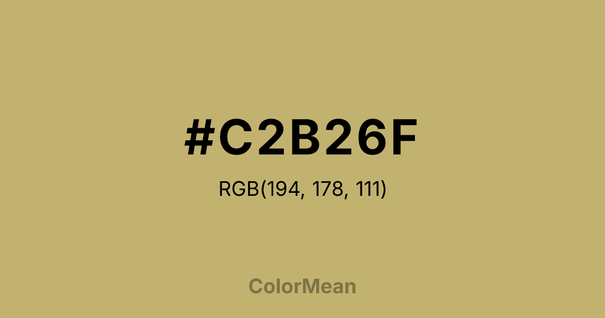 #C2B26F RGB value is (194, 178, 111). The hex color red value is 194, green is 178, and blue is 111. Its HSL format shows a hue of 48°, saturation of 40 percent, and lightness of 60 percent. The CMYK process values are 0 percent, 8 percent, 43 percent, 24 percent.