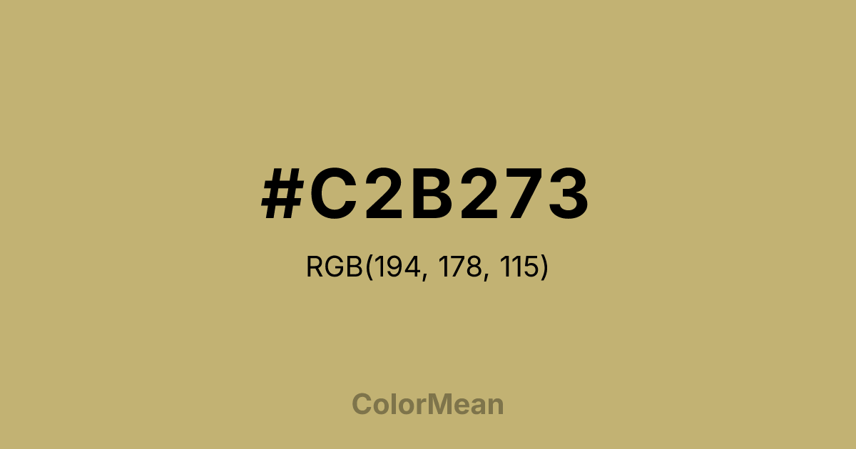 #C2B273 RGB value is (194, 178, 115). The hex color red value is 194, green is 178, and blue is 115. Its HSL format shows a hue of 48°, saturation of 39 percent, and lightness of 61 percent. The CMYK process values are 0 percent, 8 percent, 41 percent, 24 percent.