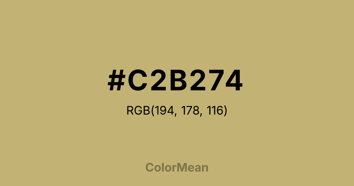 #C2B274 RGB value is (194, 178, 116). The hex color red value is 194, green is 178, and blue is 116. Its HSL format shows a hue of 48°, saturation of 39 percent, and lightness of 61 percent. The CMYK process values are 0 percent, 8 percent, 40 percent, 24 percent.