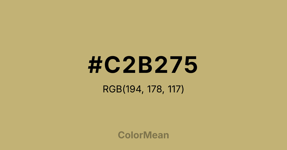 #C2B275 RGB value is (194, 178, 117). The hex color red value is 194, green is 178, and blue is 117. Its HSL format shows a hue of 48°, saturation of 39 percent, and lightness of 61 percent. The CMYK process values are 0 percent, 8 percent, 40 percent, 24 percent.
