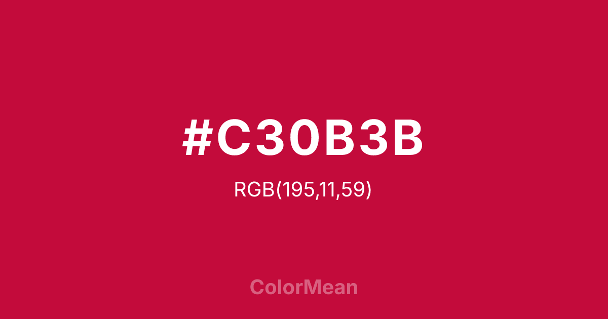 #C30B3B RGB value is (195, 11, 59). The hex color red value is 195, green is 11, and blue is 59. Its HSL format shows a hue of 344°, saturation of 89 percent, and lightness of 40 percent. The CMYK process values are 0 percent, 94 percent, 70 percent, 24 percent.